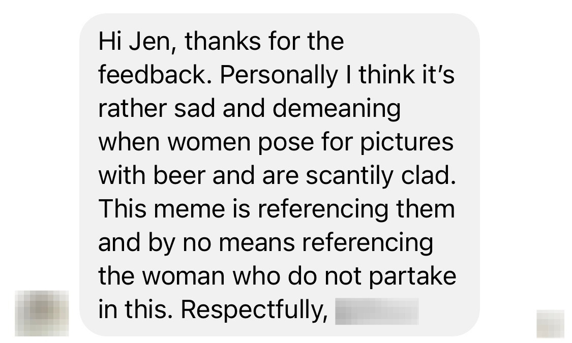 Again, maybe I shouldn’t have been surprised to see that this person posted a meme like that in a group like this, but I was. It was such a positive place for beer lovers, I thought. As it turns out, that is not true if you are a woman who dares to acknowledge both her love of beer and her sexuality in the same photo.